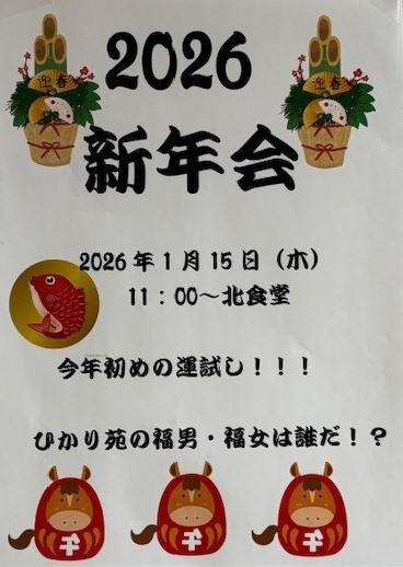 午前中は新年の挨拶、年男年女の紹介、強運の持ち主を選ぶ会合、皆様で口腔体操を兼ねて合唱を行いました。