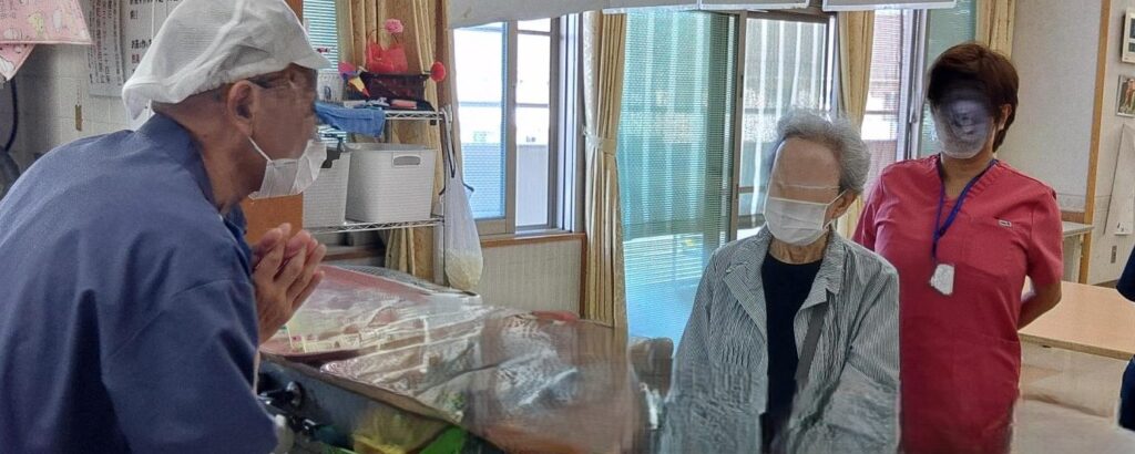 本日は地震が発生しライフラインが停止したと想定した訓練で災害時における食事提供をどのようにするかの訓練でした。また、調理員が出勤出来ないという想定も加え介護職員のみで給食提供を行いました。